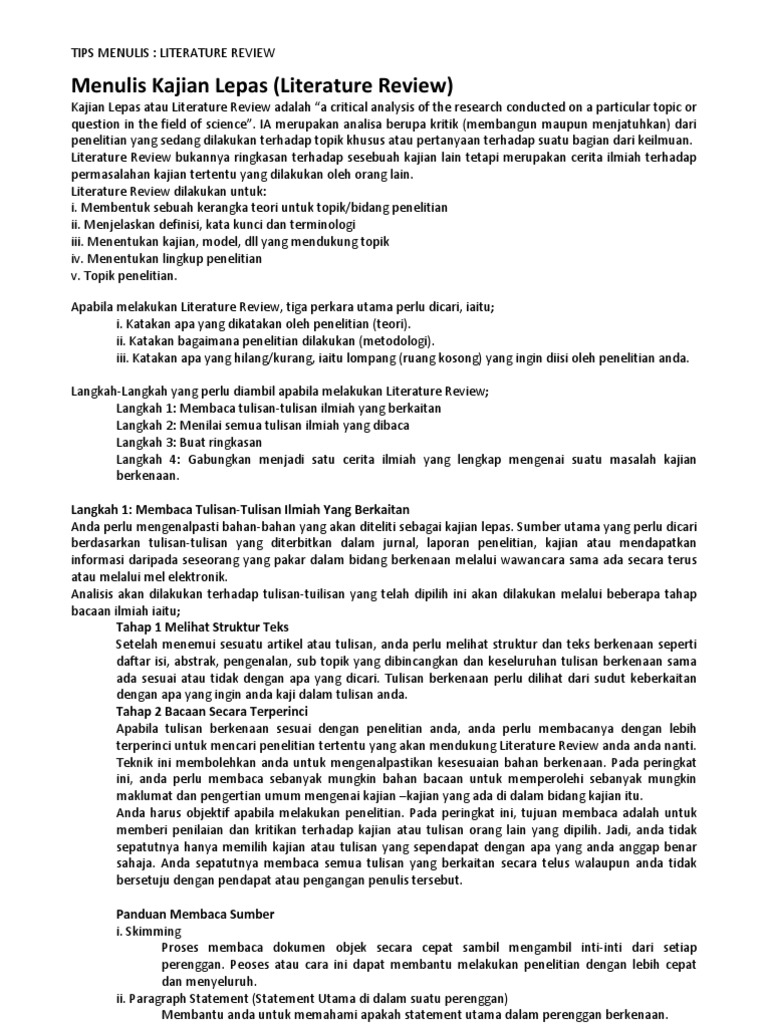 Apabila menulis kajian lepas literature review bahagikan ia kepada. Menulis semula penyataan masalah kajian dan metod secara ringkas. Ia merupakan analisa berupa kritik membangun maupun menjatuhkan dari penelitian yang sedang dilakukan terhadap topik khusus atau pertanyaan terhadap suatu bagian dari keilmuan.